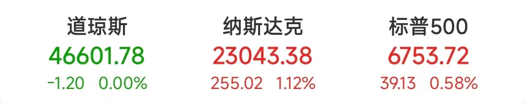 道指跌1.20點(diǎn),報(bào)46601.78點(diǎn);納指漲255.02點(diǎn),漲幅為1.12%,報(bào)23043.38點(diǎn);標(biāo)普500指數(shù)漲39.13點(diǎn),漲幅為0.58%,報(bào)6753.72點(diǎn)。