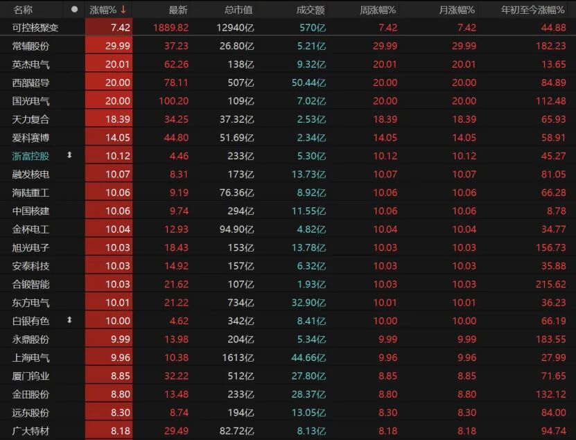 可控核聚變漲幅超過7%,常輔股份漲近30%,西部超導、國光電氣、天力復合等概念股大漲。