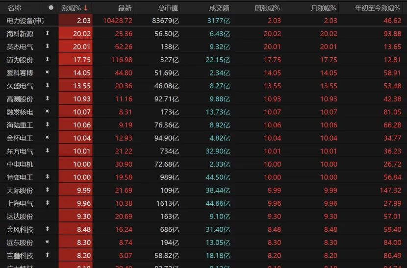 電力設備板塊也表現不錯,10只相關個股漲停,海科新源、英杰電氣“20cm”漲停,邁為股份、愛科賽博、久盛電氣、高測股份漲幅均超過10%,中電電機、特變電工、上海電氣漲停。