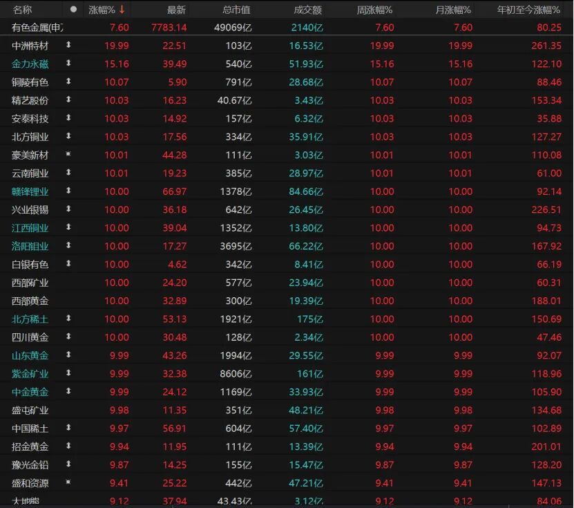 有色金屬板塊收漲7.6%,20只相關個股漲停。其中,中洲特材“20cm”漲停,金力永磁收漲15.16%報39.49元/股,銅陵有色、精藝股份、安泰科技、北方銅業、豪美新材、云南銅業、贛鋒鋰業、興業銀錫、江西銅業等個股漲停。