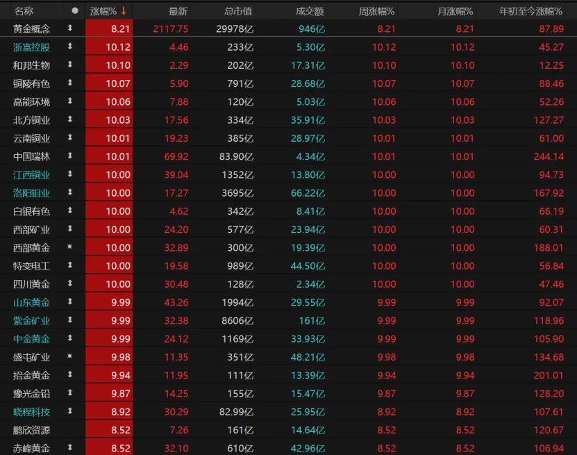 黃金概念、超導概念、可控核聚變、小金屬概念、稀土永磁等大漲。