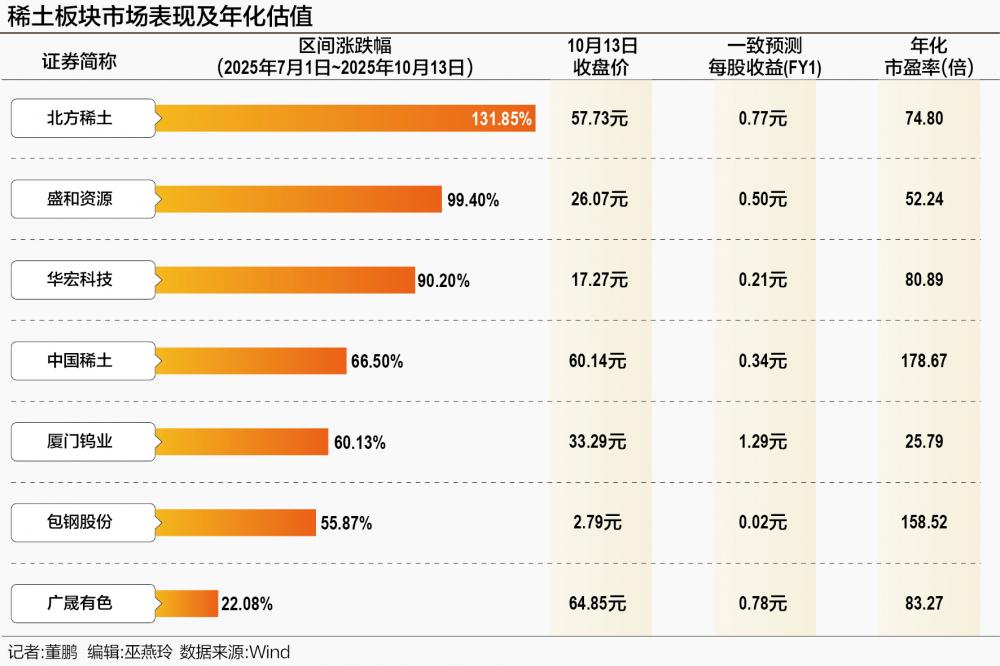 以北方稀土為例。截至13日收盤,該公司年內(nèi)漲幅超過(guò)170%,如果按照全年28億元的賣方盈利預(yù)期值估算,公司當(dāng)前估值已經(jīng)達(dá)到75倍,而估值超過(guò)百倍的稀土股亦不罕見。