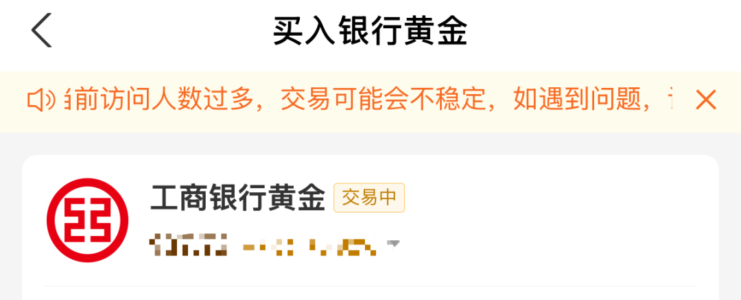 據多家媒體報道,今日(10月14日)盤中,在螞蟻財富平臺上銷售的工商銀行積存金一度出現“不可開戶”情況。截至發稿,開戶已恢復正常。不過,記者注意到,在支付寶APP“買入銀行黃金”的頁面上,已有滾動提示:“當前訪問人數過多,交易可能會不穩定,如遇到問題,請嘗試重試操作。”