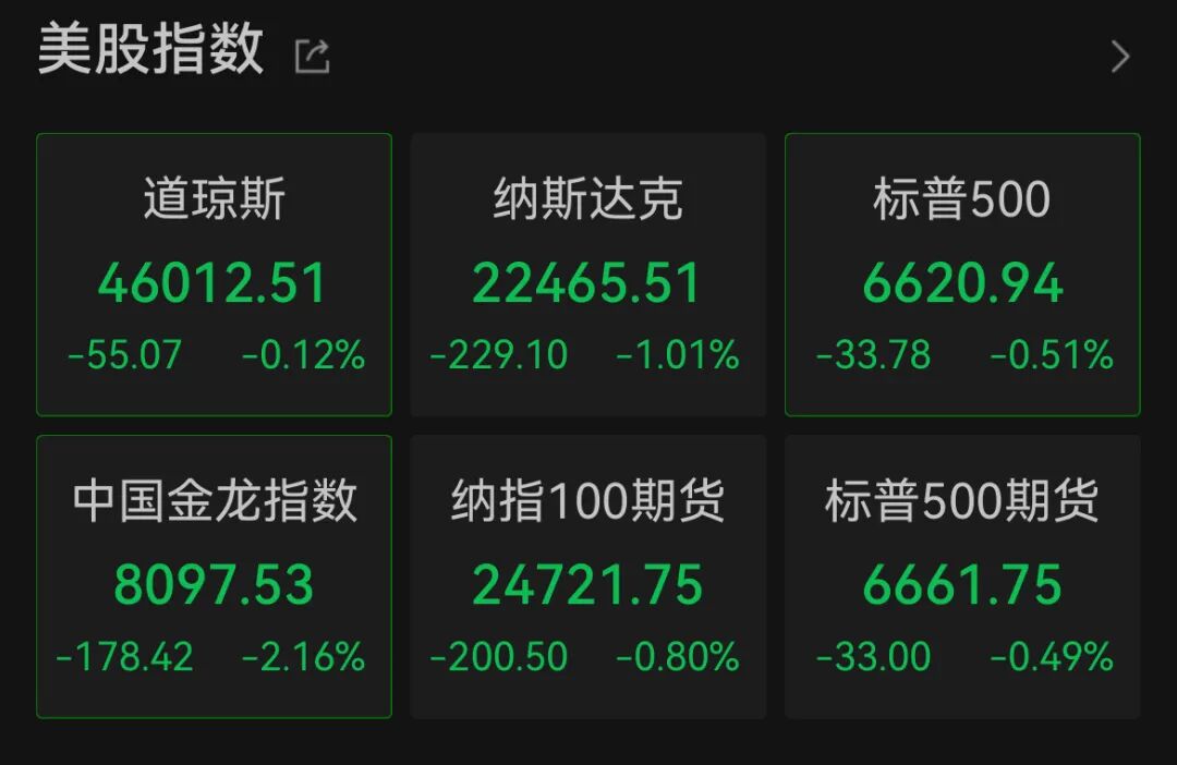 當地時間周二(10月14日),美股三大指數集體低開,截至發稿,道指跌0.12%,納指跌超1%,標普500指數跌0.51%。