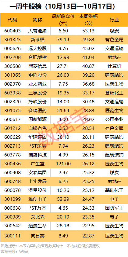 一周牛熊股出爐:大有能源累計漲幅超53%