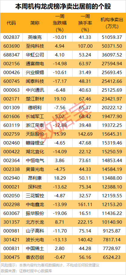 一周機構累計凈賣出的個股中,22股金額均超1億元,其中凈賣出金額最多的是英維克,達5.11億元。該股本周累計下跌10.01%,周換手率為41.33%,因日跌幅偏離值達-7.28%等1次上榜龍虎榜,買賣居前營業部中機構合計凈賣出5.11億元,同時上榜的還有深股通專用席位,凈賣出2.75億元,營業部席位一周合計凈賣出5769.22萬元。