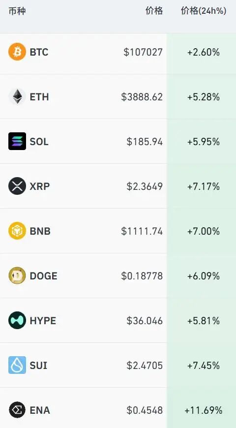 截至發稿,比特幣漲逾2%,重返107000美元;以太坊大漲超5%,站上3880美元上方;狗狗幣漲逾6%。