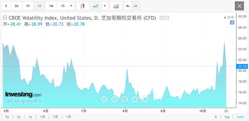美東時間周五,衡量市場波動性的芝商所(CBOE)恐慌指數VIX一度飆升至28.99,創出今年4月底以來的最高水平。盡管收盤時回落至了21附近,但依然位于年內高位。
