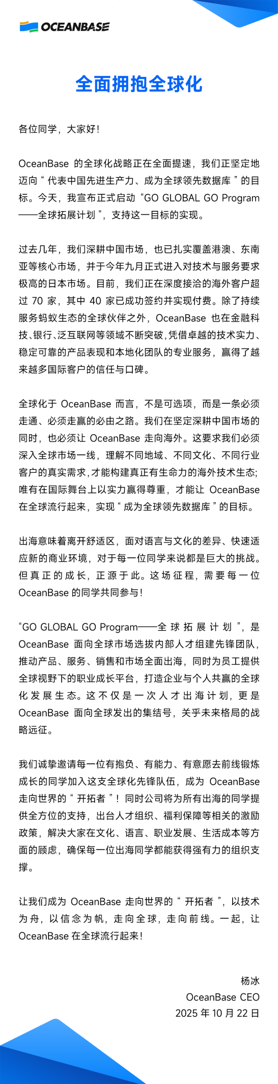 據了解,為加速全球化布局,OceanBase擬通過“GO GLOBAL GO Program”計劃,面向全球市場選拔內部人才組建先鋒團隊,推動產品、服務、銷售和市場全面出海。
