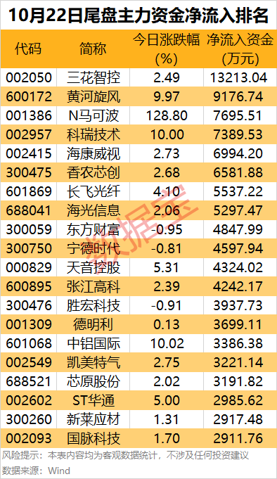 熱門股三花智控尾盤主力資金凈流入1.32億元,居首;黃河旋風漲停,尾盤主力資金凈流入9176.74萬元,居次席。