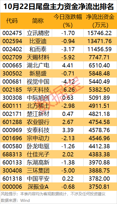 立訊精密、比亞迪和和而泰尾盤主力資金凈流出均超1.1億元,還有天賜材料、湖北廣電、新易盛、視覺中國等熱門股尾盤凈流出金額居前。