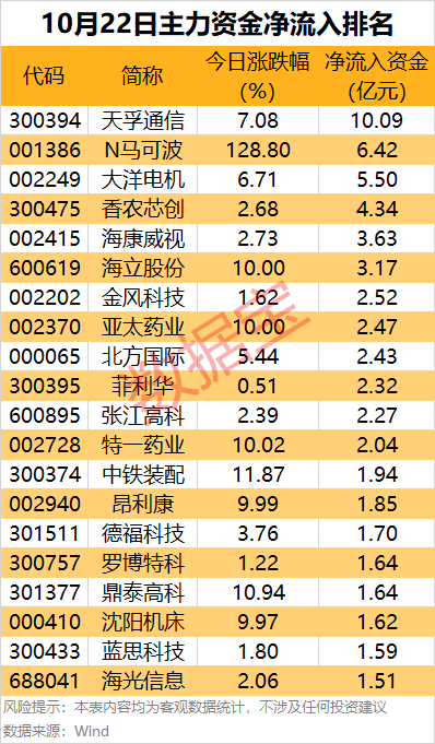 CPO概念股天孚通信主力資金凈流入10.09億元,居首;該股漲7.08%,成交額超93億元。資金面上,10月21日,天孚通信融資凈買入3.18億元,凈買入額創2025年9月11日以來新高,連續2日凈買入,累計凈買入4億元;近5個交易日融資累計凈買入3.86億元,當前融資余額32.62億元,較前一日增10.81%,占流通市值比例增至2.52%。