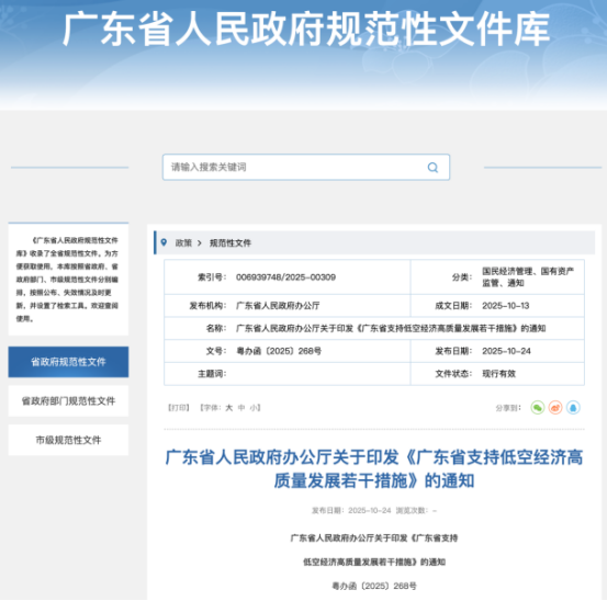 10月24日,廣東省人民政府辦公廳印發《廣東省支持低空經濟高質量發展若干措施》的通知,提出了16條具體舉措,打造全國領先的低空經濟產業發展高地。