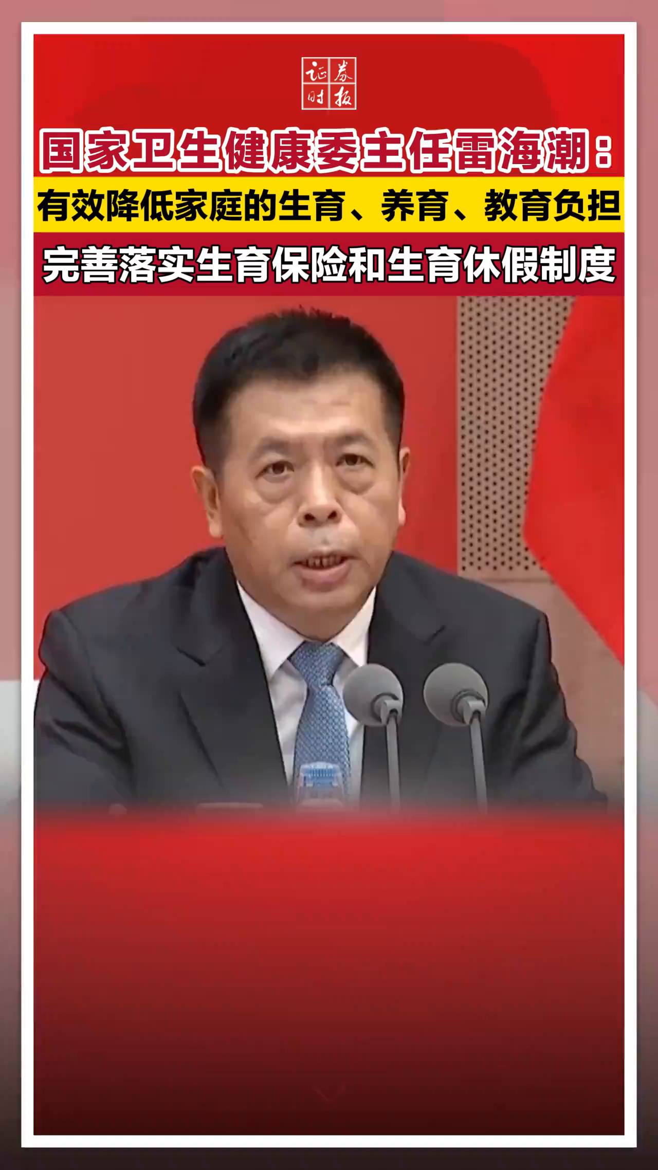 國家衛健委主任雷海潮:有效降低家庭的生育、養育、教育負擔,完善落實生育保險和生育休假制度
